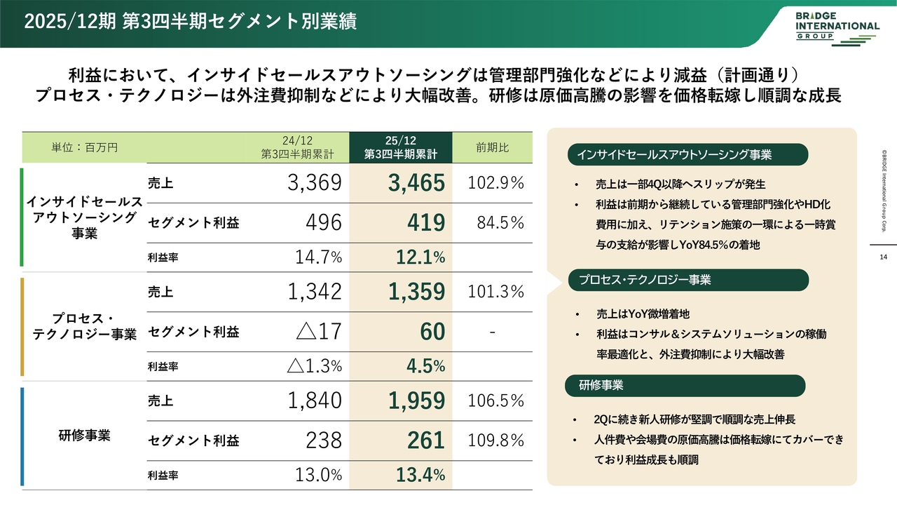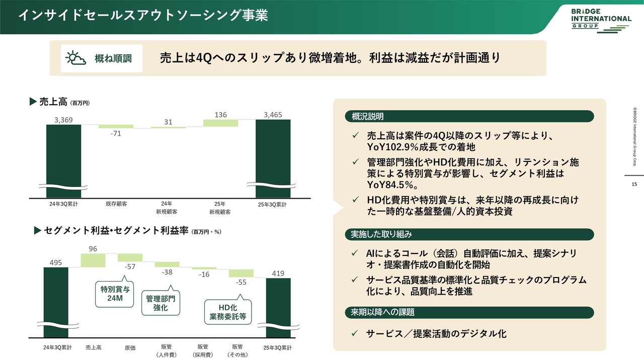 セグメント利益は、管理部門の強化や、持株会社体制への移行に伴う費用に加え、社員のリテンション施策による特別賞与の支給が発生し、前年同期比84.5パーセントとなりました。持株会社体制移行の費用や、特別賞与は来年以降の再成長に向けた一時的な基盤整備および人的資本投資と位置づけており、本年の期初計画どおりの進捗です。