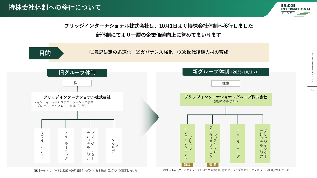 持株会社への移行については、10月1日に無事完了しました。新しいグループ体制では、私が率いるブリッジインターナショナルグループという純粋持株会社の配下に、4つの事業会社を統合し、事業展開を強化していきます。