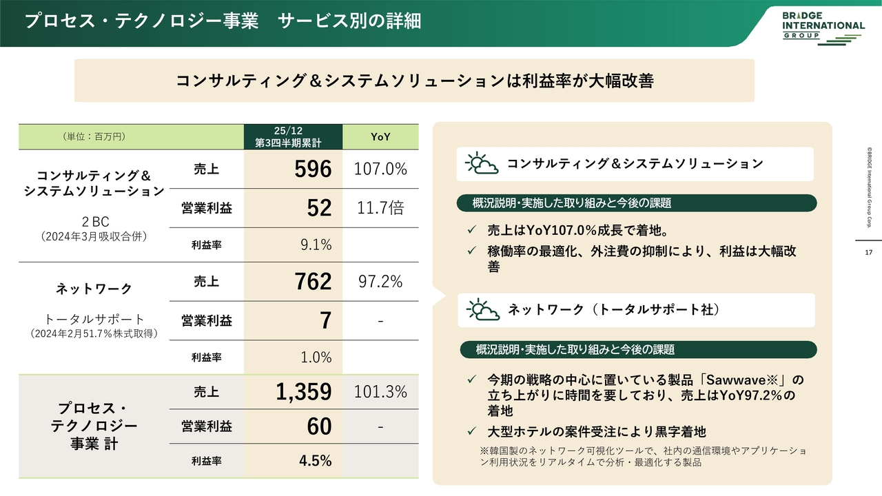 プロセス・テクノロジー事業は、売上がほぼフラットだったものの、利益は大幅に改善されています。これには、トータルサポート社の件も関わっていますので、後ほどご案内します。研修事業は堅調に推移しました。