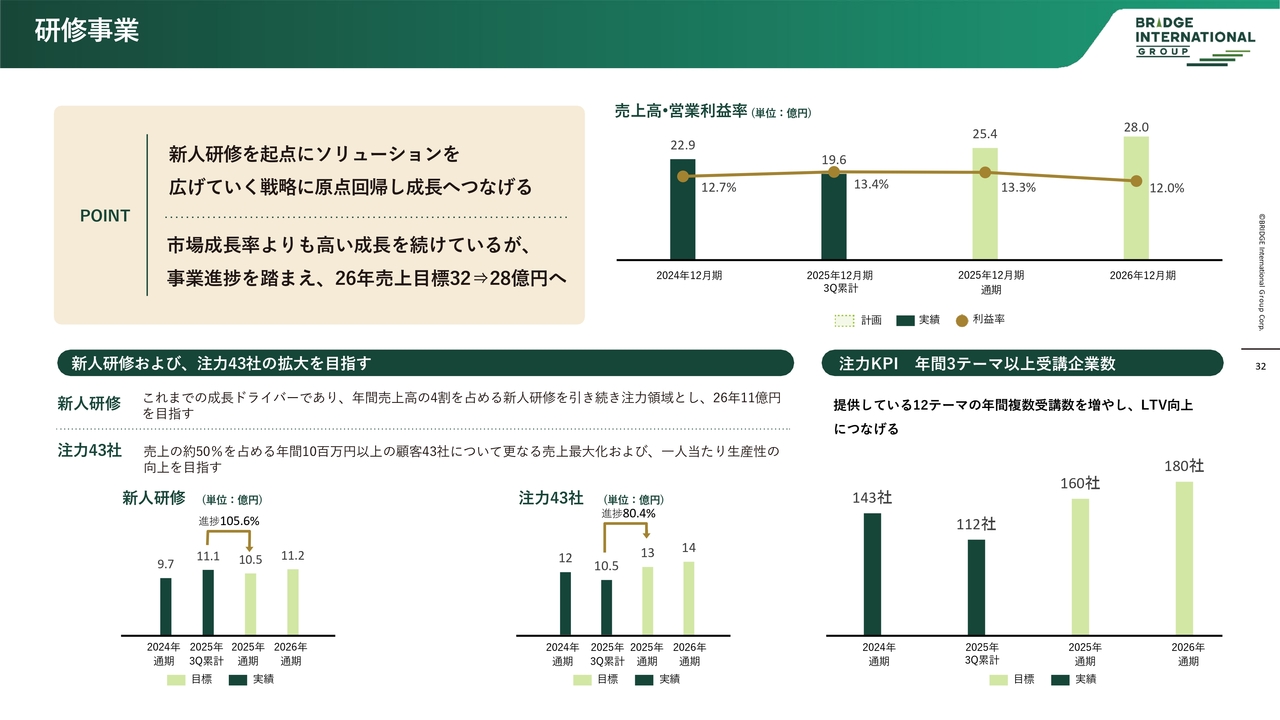研修事業では、新入社員研修に依存しすぎない体制を目指し、アップセルを積極的に推進しています。そのため、年間3テーマ以上の研修を実施する企業を増やすことを課題とし、180社を目標に掲げています。