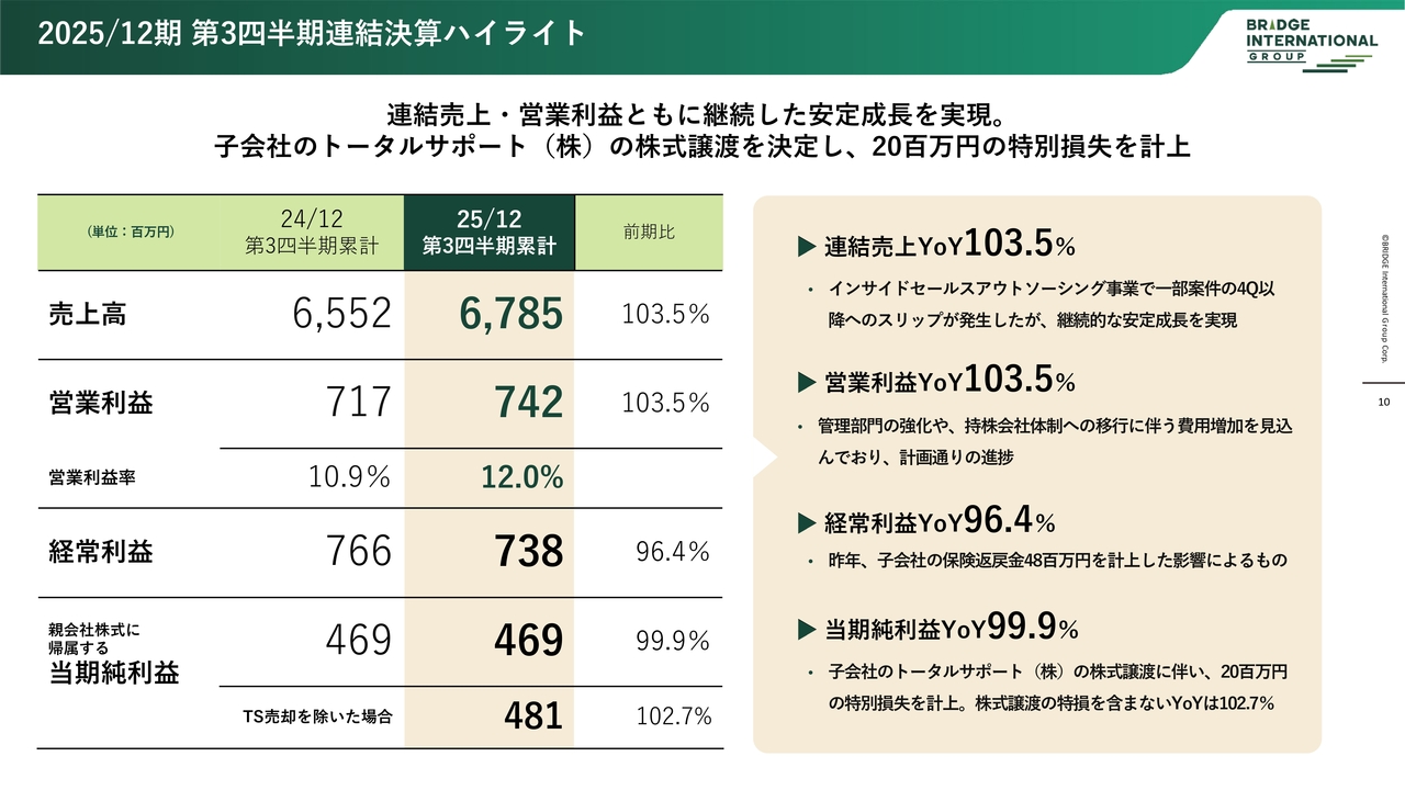吉田融正氏(以下、吉田):みなさま、こんにちは。ブリッジインターナショナルグループ株式会社代表取締役会長兼CEOの吉田です。本日は2025年12月期第3四半期決算についてご説明します。よろしくお願い申し上げます。