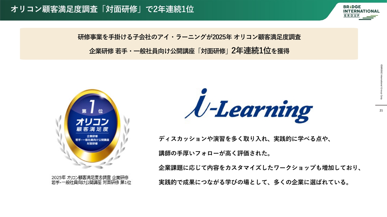 第3四半期には、子会社のアイ・ラーニング社の研修事業が、オリコン顧客満足度調査「企業研修 若手・一般社員向け公開講座『対面研修』」の領域で高い評価をいただきました。2年連続1位を獲得したといううれしいニュースです。