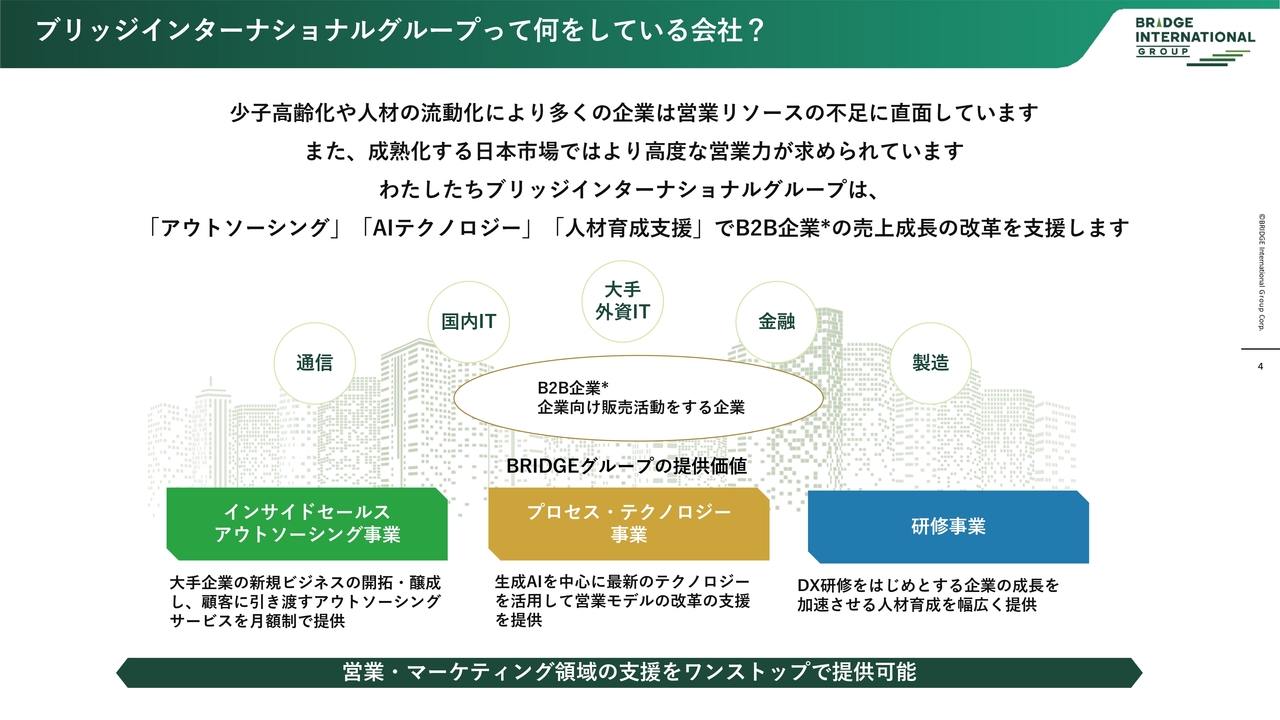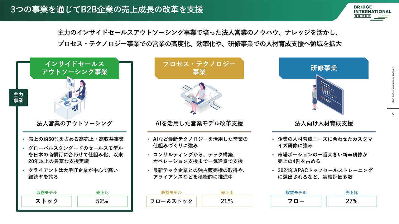 当社はB2B企業の売上成長改革を支援することを目的に、インサイドセールスアウトソーシング事業、プロセス・テクノロジー事業、法人向けの人材育成を提供する研修事業の3つのサービスを展開しています。