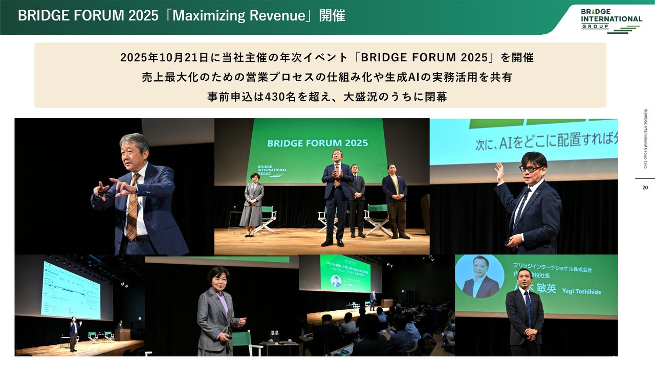 トピックスをご案内します。10月21日に当社主催の「BRIDGE FORUM 2025」を開催しました。このイベントでは、営業プロセスの仕組みや「生成AIをこの領域にどう活用するか?」といった事例についてご紹介しました。事前申込は430名を超え、非常に盛況なかたちで閉会しました。