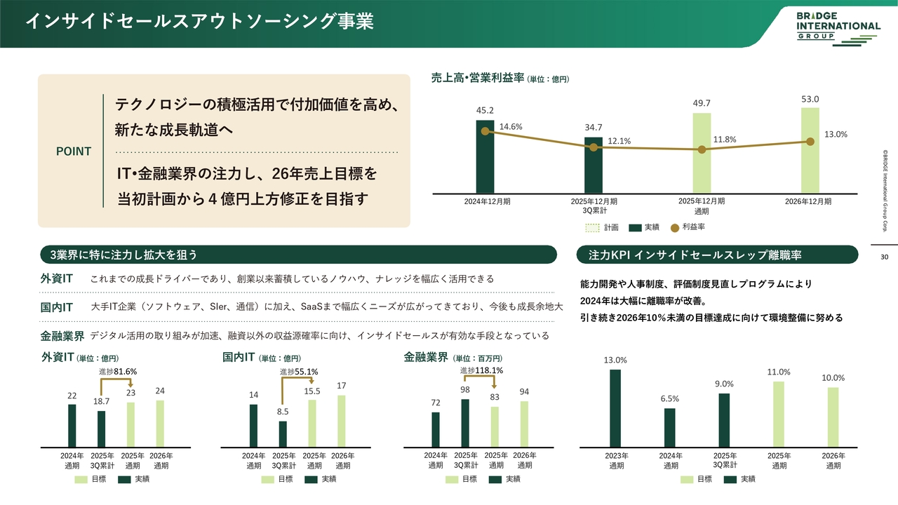 インサイドセールスアウトソーシング事業は順調に進んでいます。スライド下段で取り上げている業界動向では、外資ITの進捗は第3四半期で81.6パーセントと、順調な状況です。