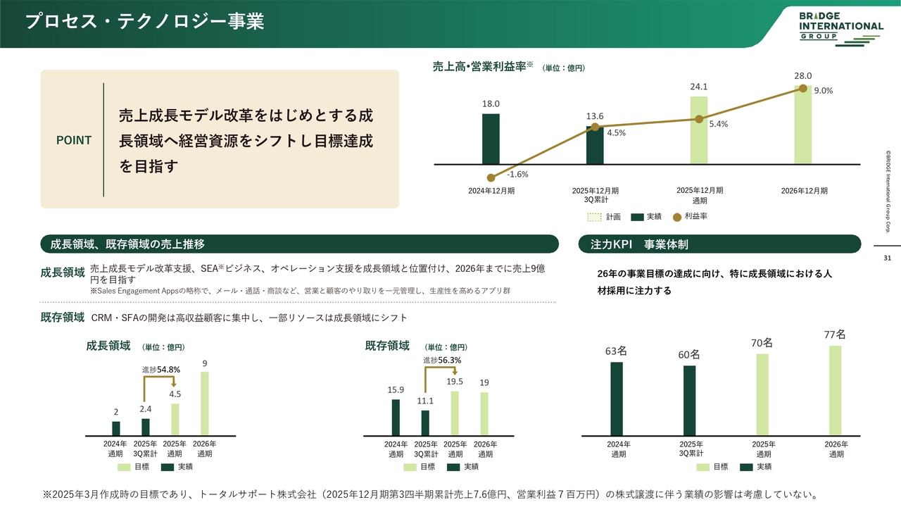 既存領域については目標を上回っていますが、依然として少し不足している部分があります。この点については、トータルサポート社の影響があると分析しています。