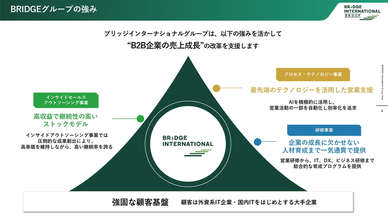 当社グループの強みは、冒頭でお話ししたインサイドセールスアウトソーシング事業、テック系のプロセス・テクノロジー事業、研修事業の3つの事業が三位一体となり、強固な顧客基盤を構築している点です。