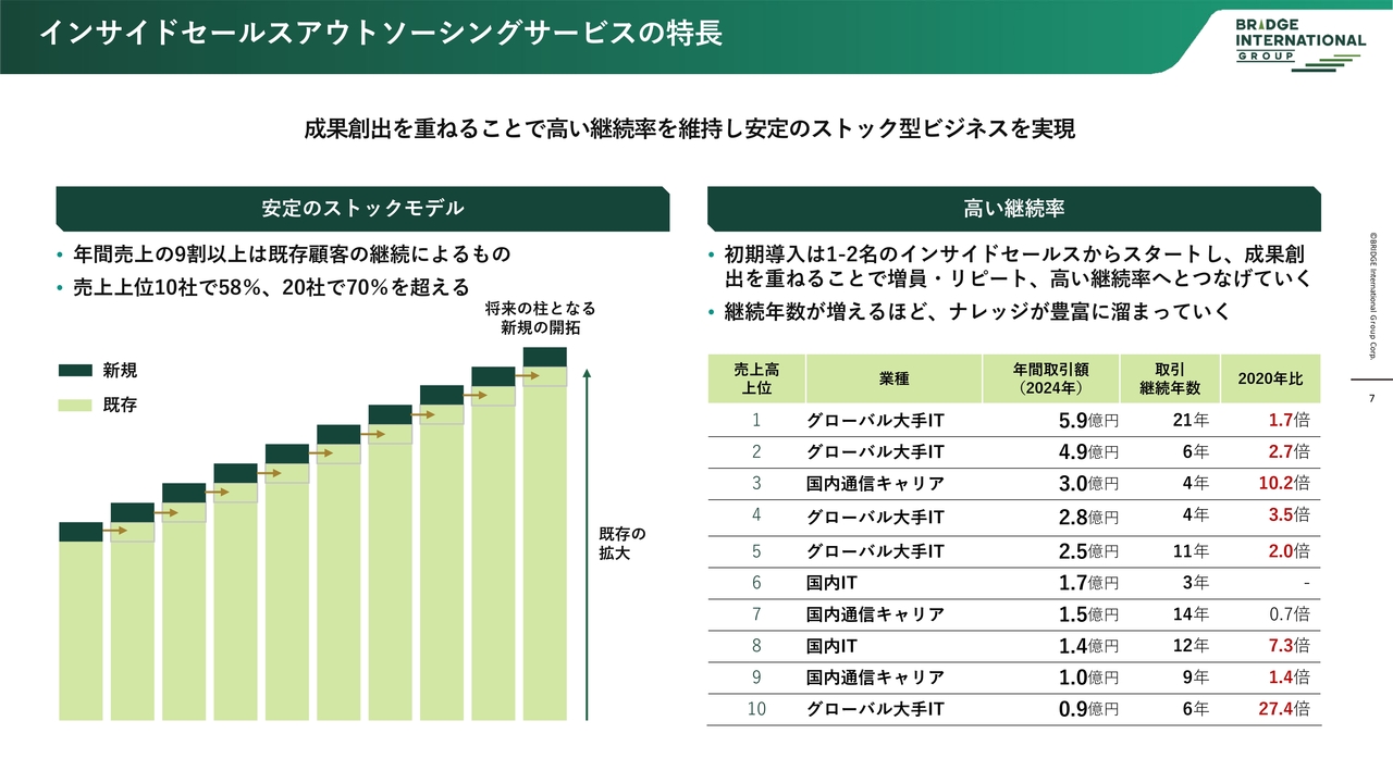 さらに、トップ10社の契約継続年数は平均9年であり、継続的にサービスを展開できています。