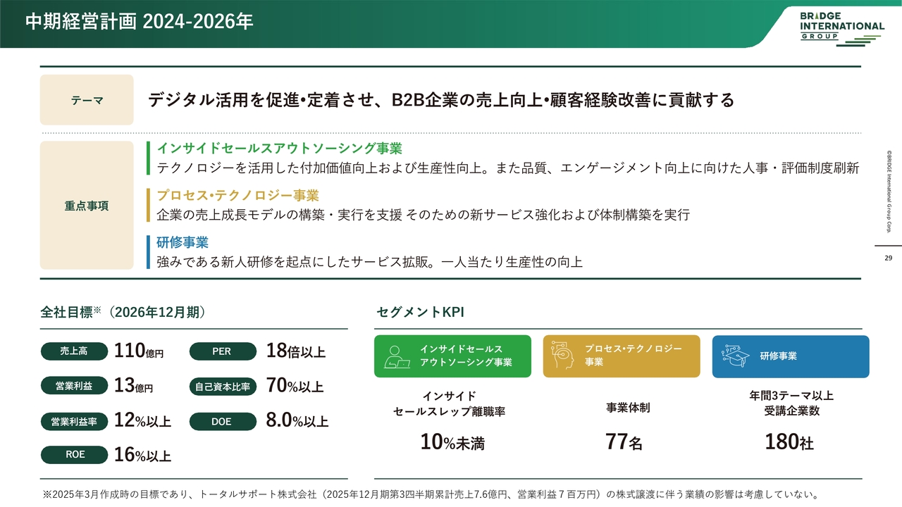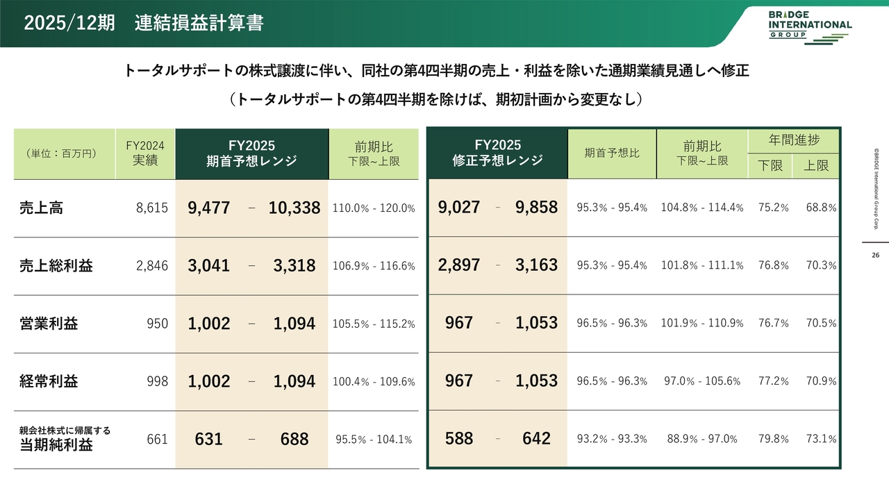 吉田:2026年12月期会社計画を発表する2026年2月にあらためて開示します。ただし、連結営業利益に対するトータルサポート社の影響は軽微です。