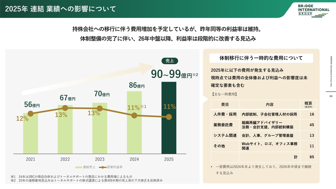 2025年連結業績への影響についてです。ホールディング化に伴い約8,500万円の費用を一時的に計上しています。