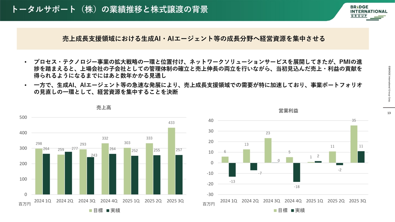 トータルサポート社の実績を振り返ると、売上は予定どおり進まず、利益も計画どおりには達成できませんでした。まだ成長の可能性を秘めた企業ですが、時間を要することを踏まえ、今やるべき成長領域に経営資源を集中するため、この決断をしました。
