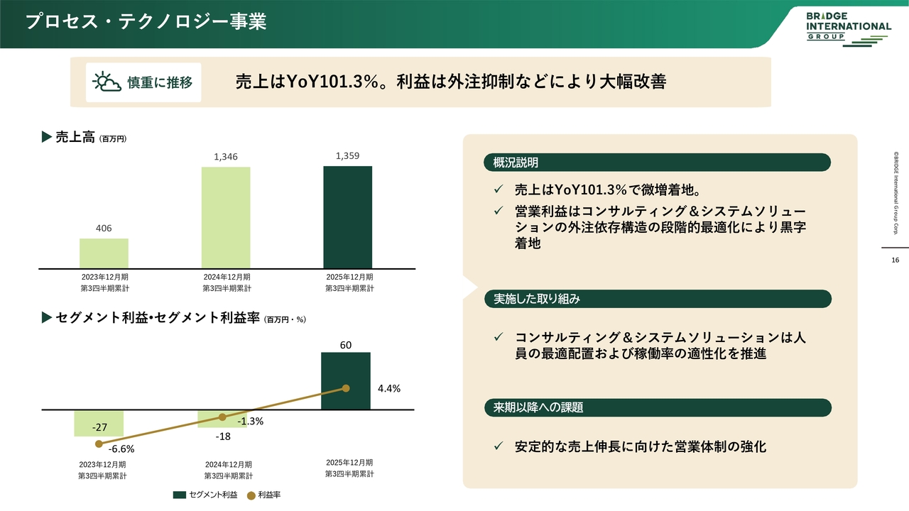 プロセス・テクノロジー事業全体としては売上高13億5,900万円、営業利益6,000万円という結果となりました。