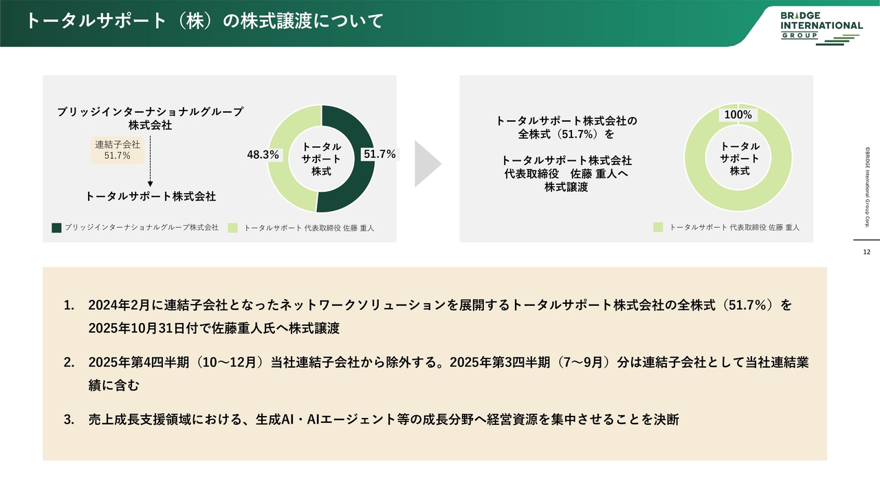 トータルサポート社は2024年2月に連結子会社となりました。当社は51.7パーセントの株式を保有していましたが、10月31日付で同社社長の佐藤氏に株式を譲渡しました。この第3四半期までは連結子会社として決算を連結しています。
