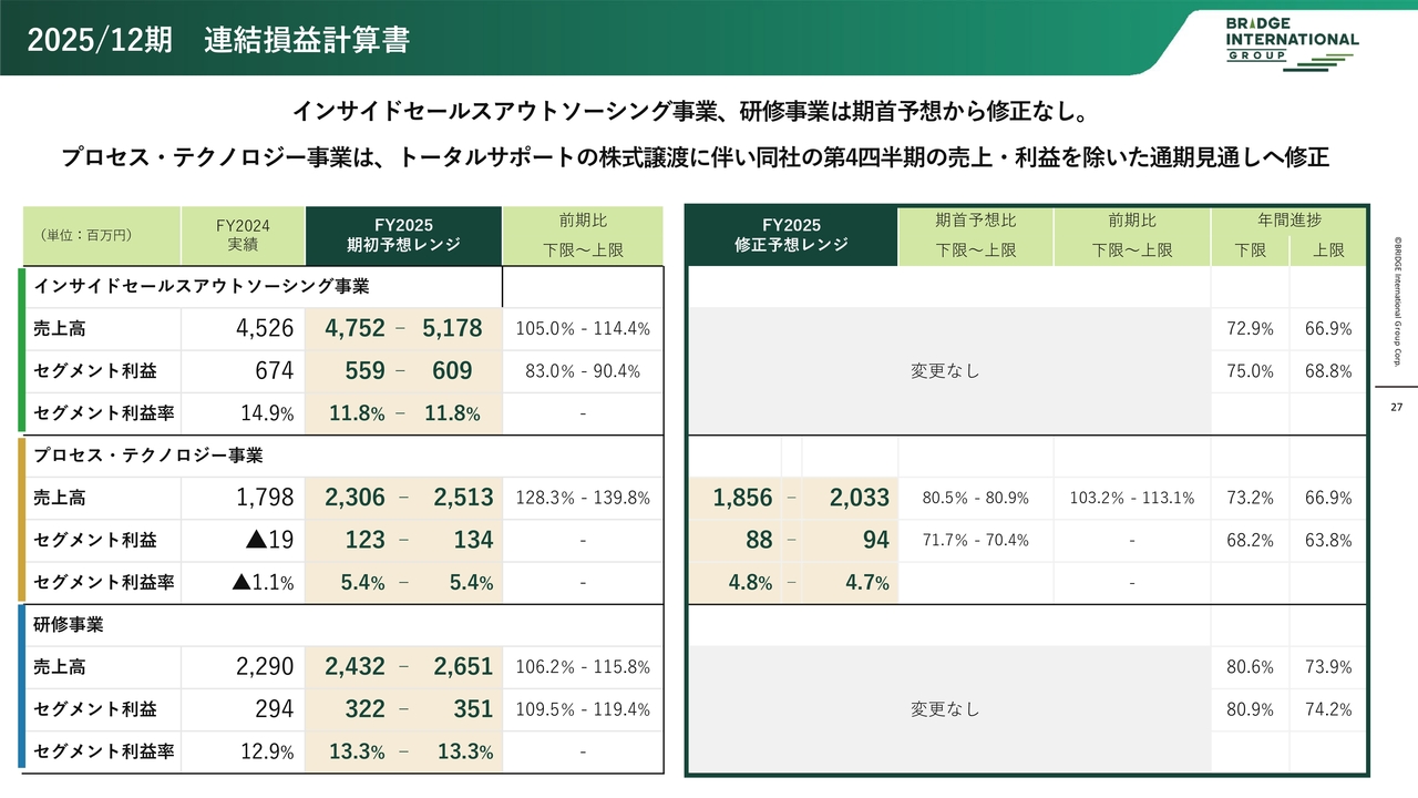 セグメント別では、プロセス・テクノロジー事業のみがトータルサポート社の影響を受けるため、売上レンジの下限を期初予想では23億600万円としていましたが、今回の修正で18億5,600万円に変更しました。