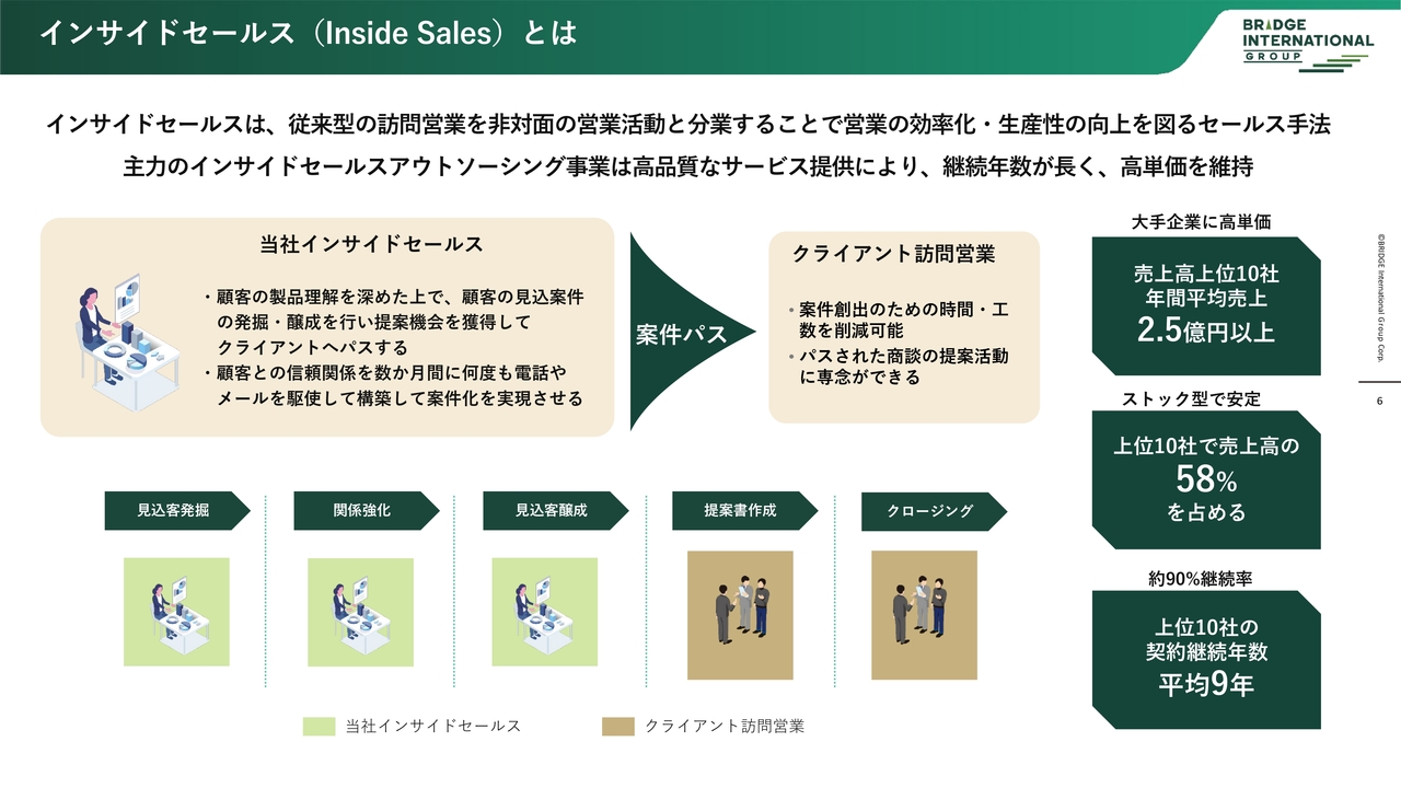 さらに、これらの内容をクライアントの営業担当者に過去の接触情報などとともに提供するのが、この事業の中心となる業務です。このように、営業プロセスを分業することで、効率的かつ効果的な営業活動をサポートするサービスです。