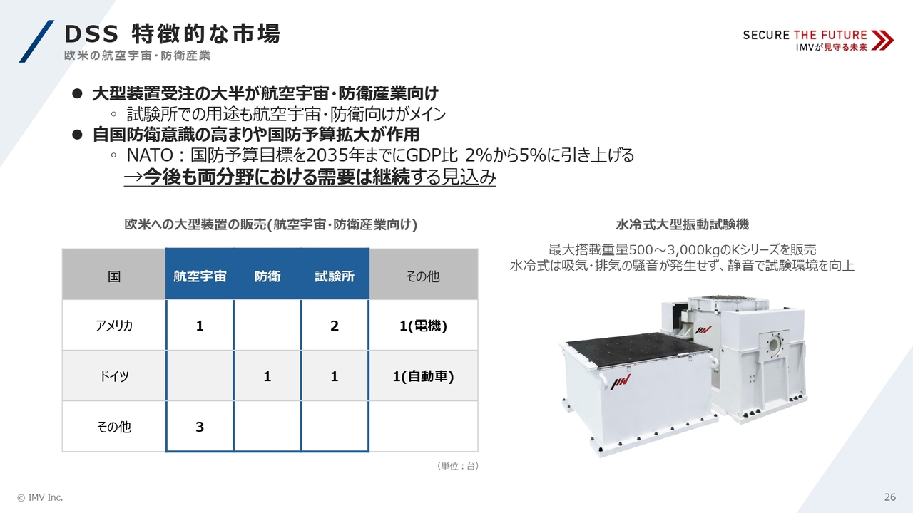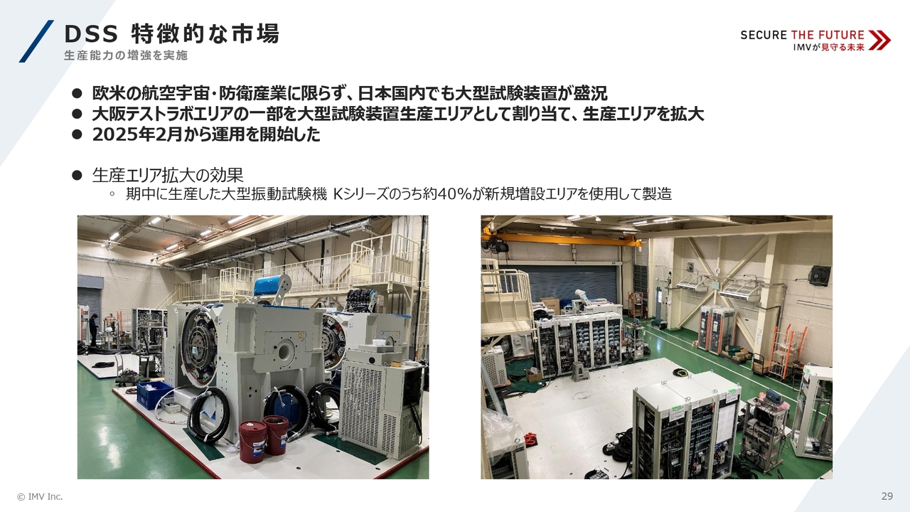 スライド右下に記載の当社Kシリーズは、最大搭載質量3トンを許容でき、この大型装置の納入実績が当期の売上を大きく押し上げました。スライドの表に記載のとおり、大型装置受注の大半は航空宇宙・防衛産業向けとなっています。