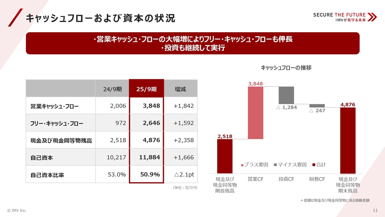 試験所の増強などにより投資キャッシュ・フローも増加しましたが、フリー・キャッシュ・フローは26億4,600万円まで増やすことができました。