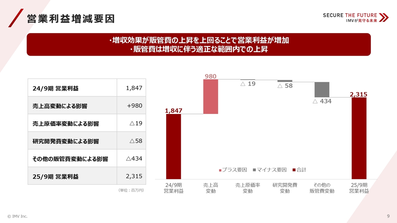 こちらのスライドでは、営業利益の増減要因を分析しています。ご覧のとおり、増収効果が販管費の上昇を上回り、営業利益を23億1,500万円まで引き上げることができました。