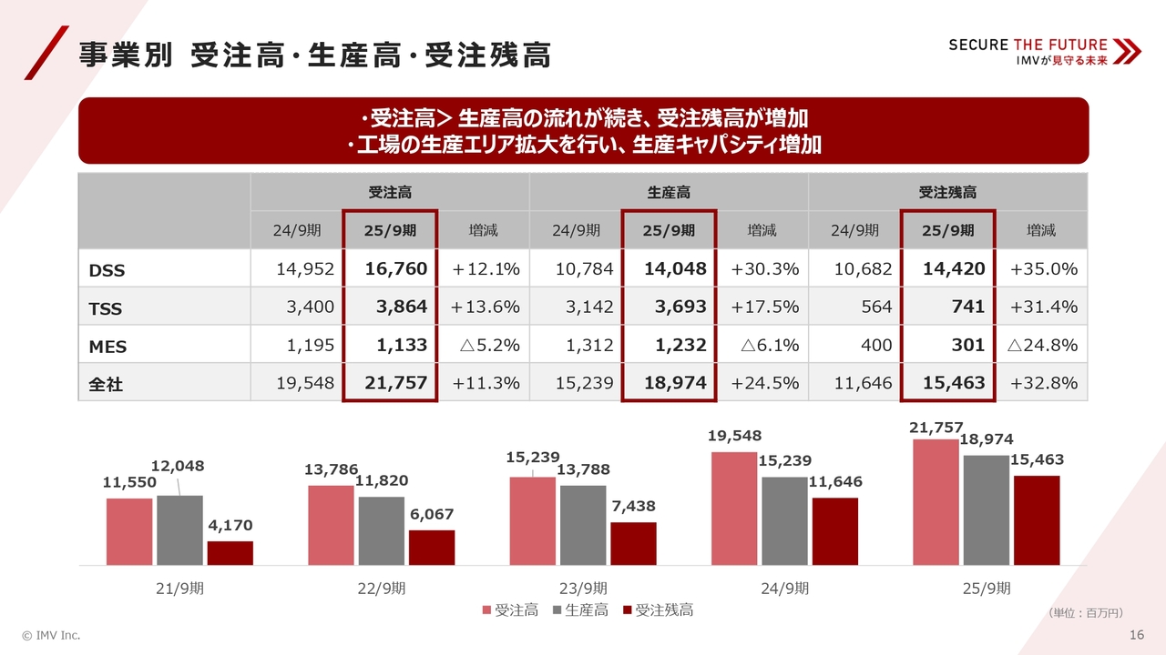 こちらのスライドでは、事業ごとの受注高、生産高、受注残高の状況を示しています。当期は工場の生産キャパシティを増加させ、生産高を大幅に伸ばすことができました。