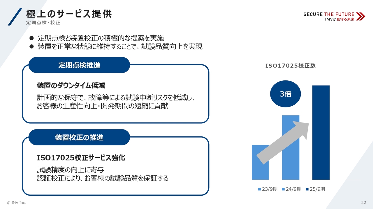 その一環として、お客さまの装置を常に最適な状態でお使いいただけるよう、定期点検や装置の校正を積極的に提案しています。この取り組みにより、校正数は3倍に増加し、故障による試験の中断が大幅に減少したと報告を受けています。