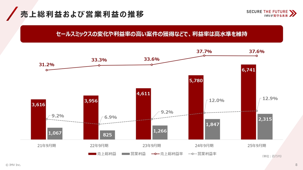 しかし、セールスミックスの変化や粗利率の良い案件の影響により、売上総利益率は前期とほぼ変わらない高水準を維持することができました。