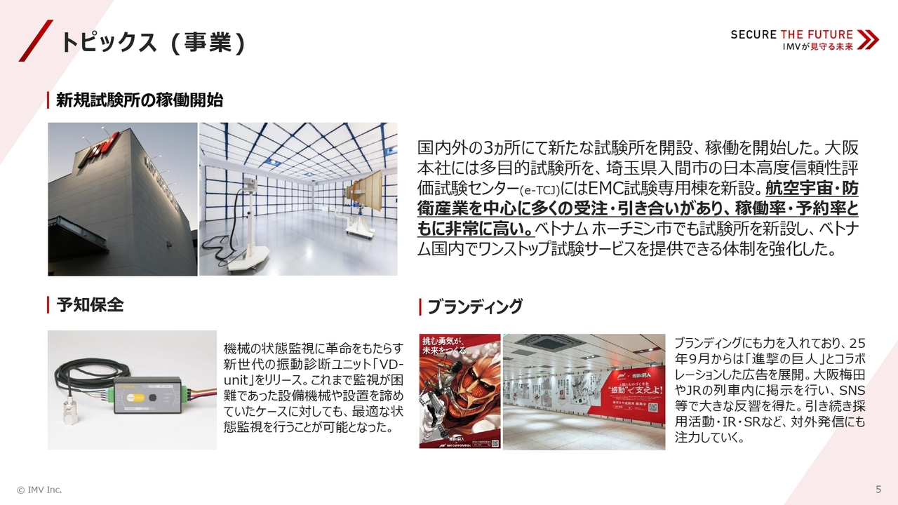 このうち、大阪の多目的試験所と入間のEMC試験専用棟は、航空宇宙・防衛産業といった成長分野のお客さまから多くの受注や引き合いをいただいており、稼働率・予約率ともに非常に高い水準で推移しています。
