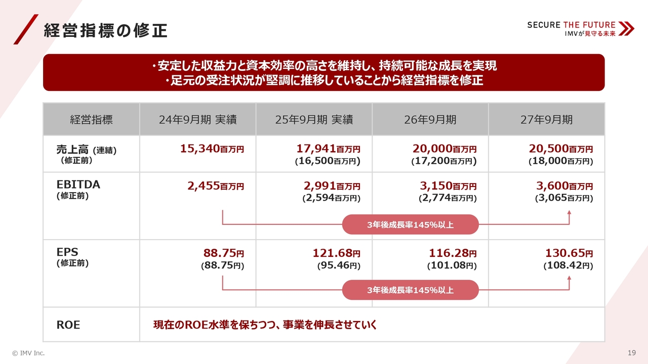 今回の決算結果、および足元の受注や引き合い状況が堅調に推移していることを受け、全期間にわたって中期経営計画の経営指標を修正しました。
