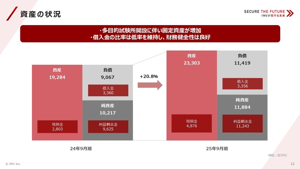 この背景には、好調な受注を受けたことによる営業債権の増加と、積極的な設備投資による有形固定資産の増加があります。借入金の比率は低く、財務健全性は良好であると認識しています。