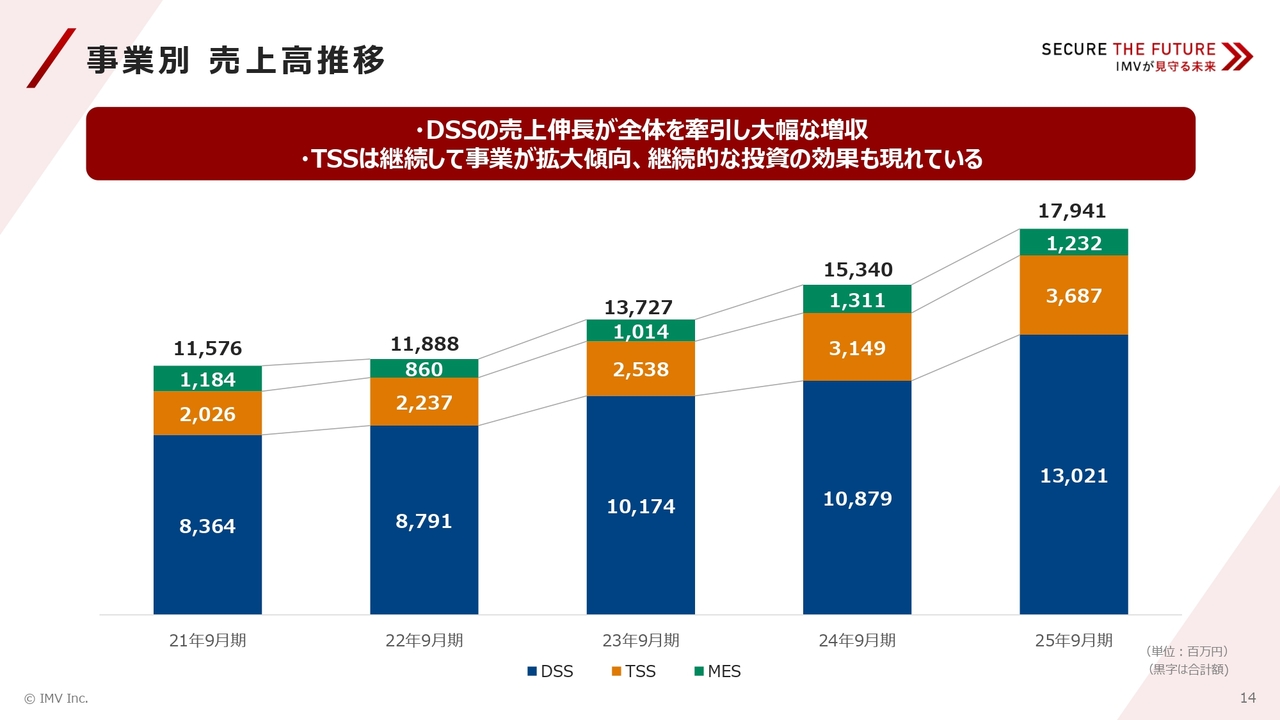 セグメント別売上は、スライド下部の表にまとめています。主力事業であるDSSとTSSは前期から大きく売上を伸ばした一方で、MESは海外向け地震計の伸び悩みにより減収となりました。詳細については、以降のスライドでご説明します。