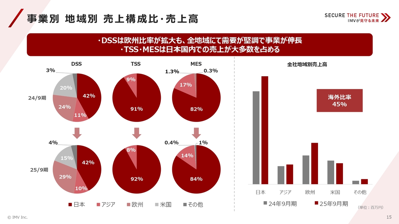 最も特徴的な動きとして、日本国内の売上が前期から大きく伸びた点があります。その背景には、主力のDSS事業において、国内の自動車関連および防衛関連からの大型案件に恵まれたことが挙げられます。
