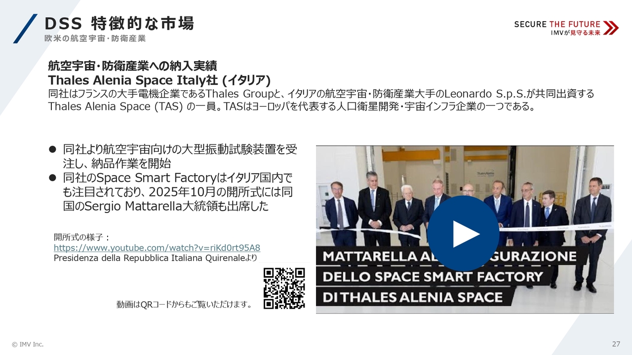 同社は大規模な衛星生産拠点を立ち上げ、その設備の1つとして当社の装置を採用いただきました。このプロジェクトはイタリアの宇宙産業において中心的な役割として注目されており、先月にはイタリア大統領が視察に訪れ、当社の装置もご紹介いただきました。
