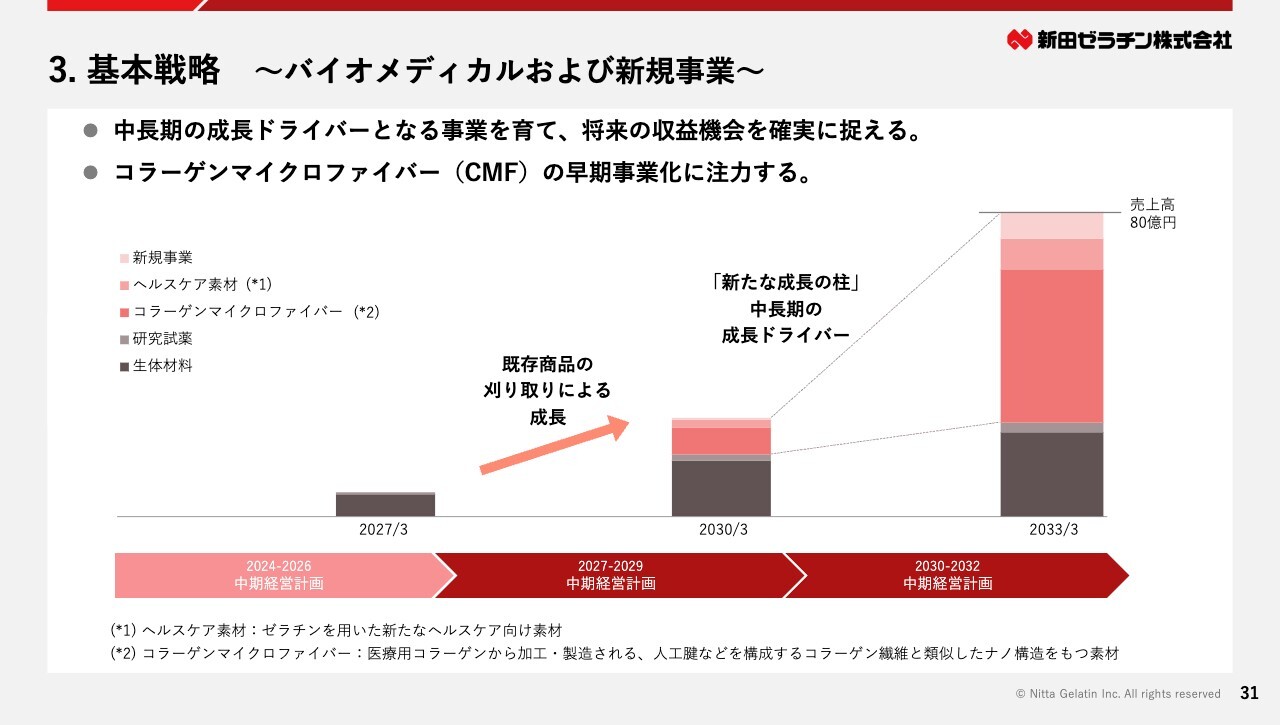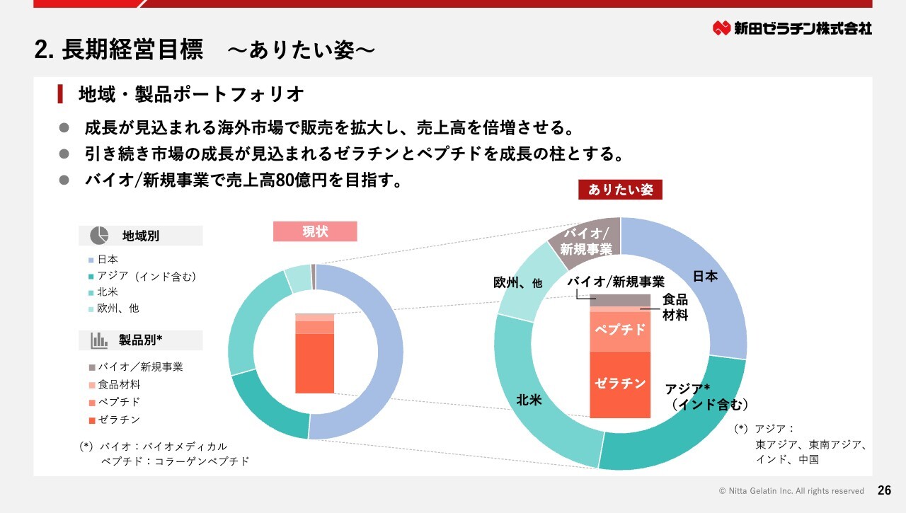 製品別では、引き続き市場の成長が見込まれるゼラチンとコラーゲンペプチドを成長の柱とします。さらに、バイオメディカルや新規事業を「新たな成長の柱」と位置づけ、売上高80億円を目指します。