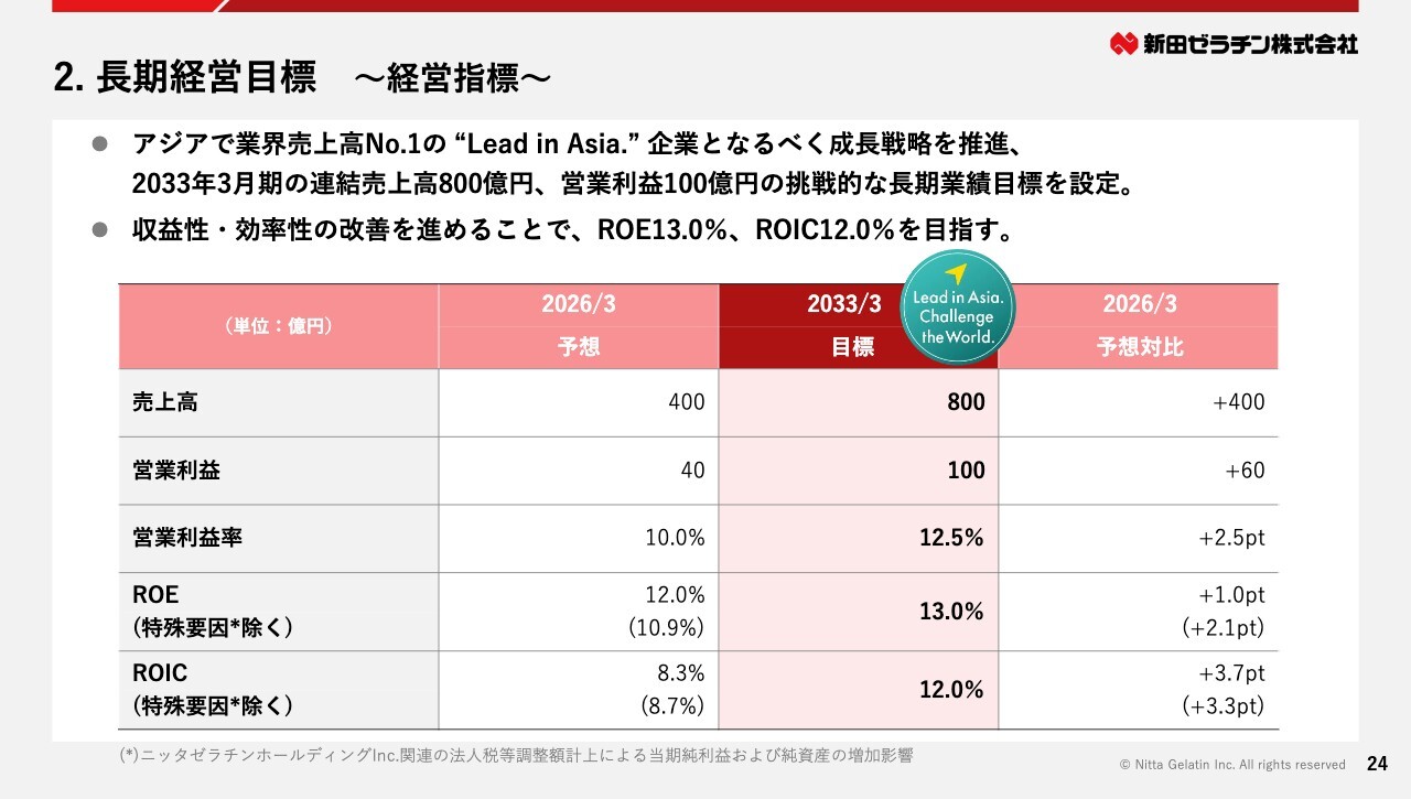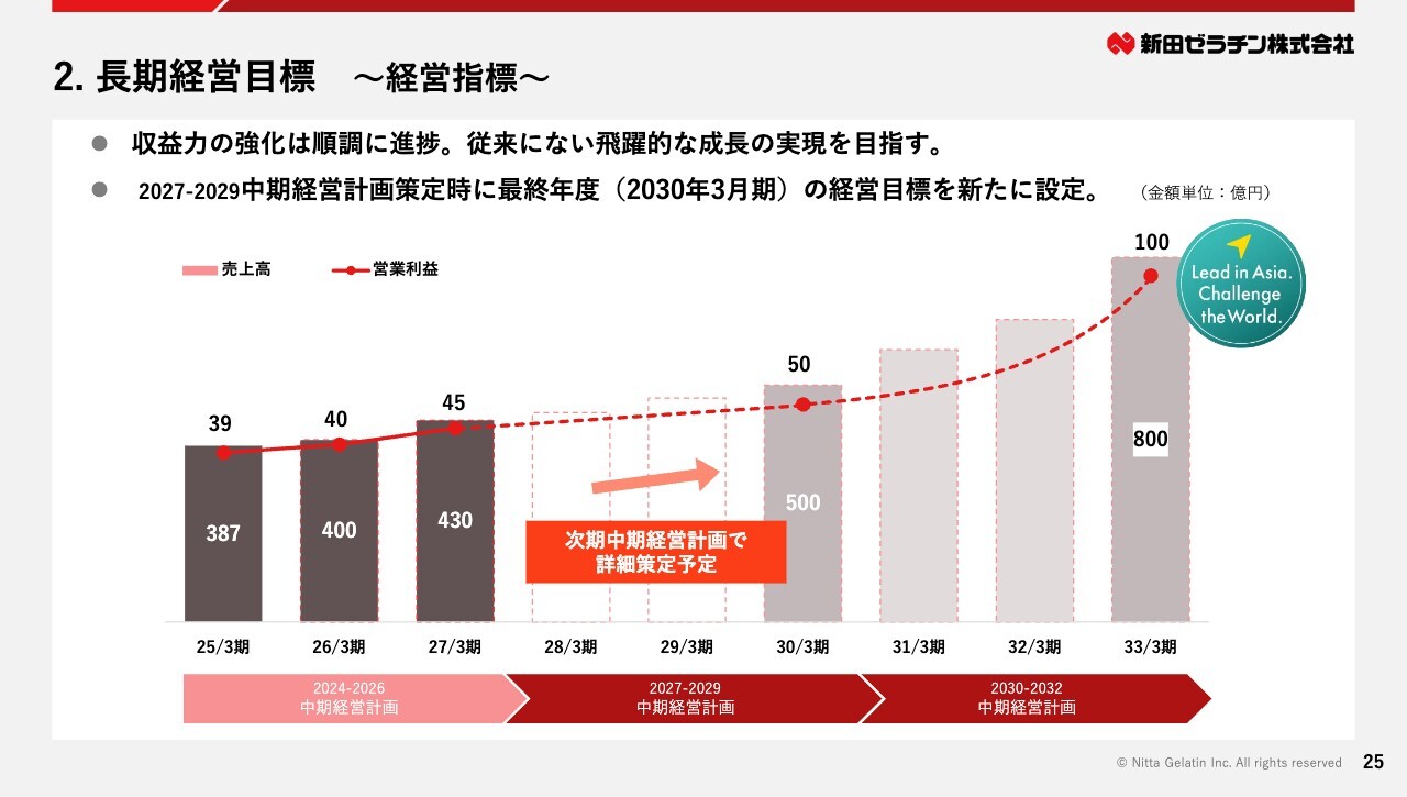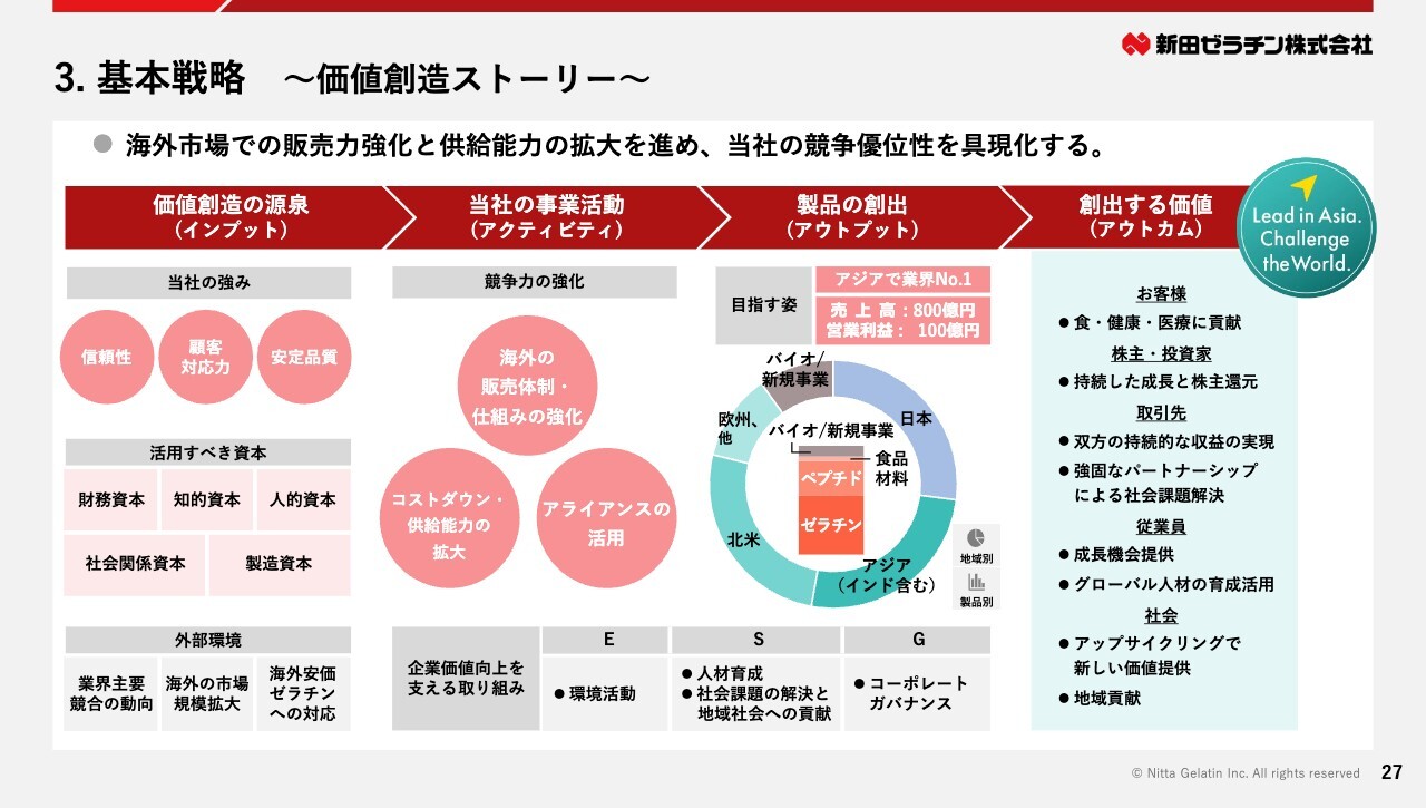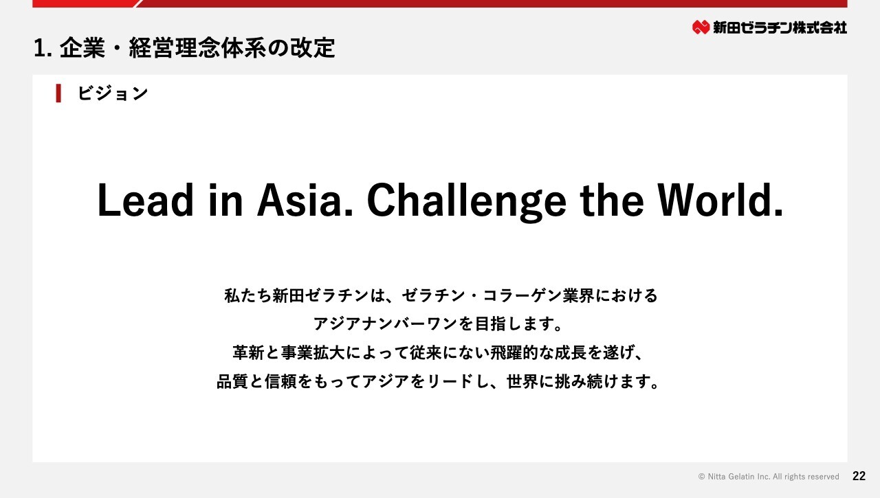 先にお示ししたビジョンにあるとおり、当社はゼラチン・コラーゲン業界で売上高アジアNo.1、すなわち「Lead in Asia.」の企業となるべく、成長戦略を強力に推進します。
