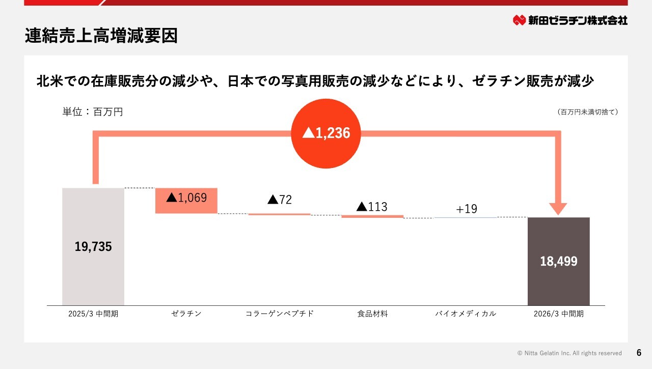 売上高全体は、前期から12億3,600万円の減収となりました。北米での在庫販売分の減少や、日本での写真用販売の減少などにより、ゼラチン販売が減少したことが主な要因です。