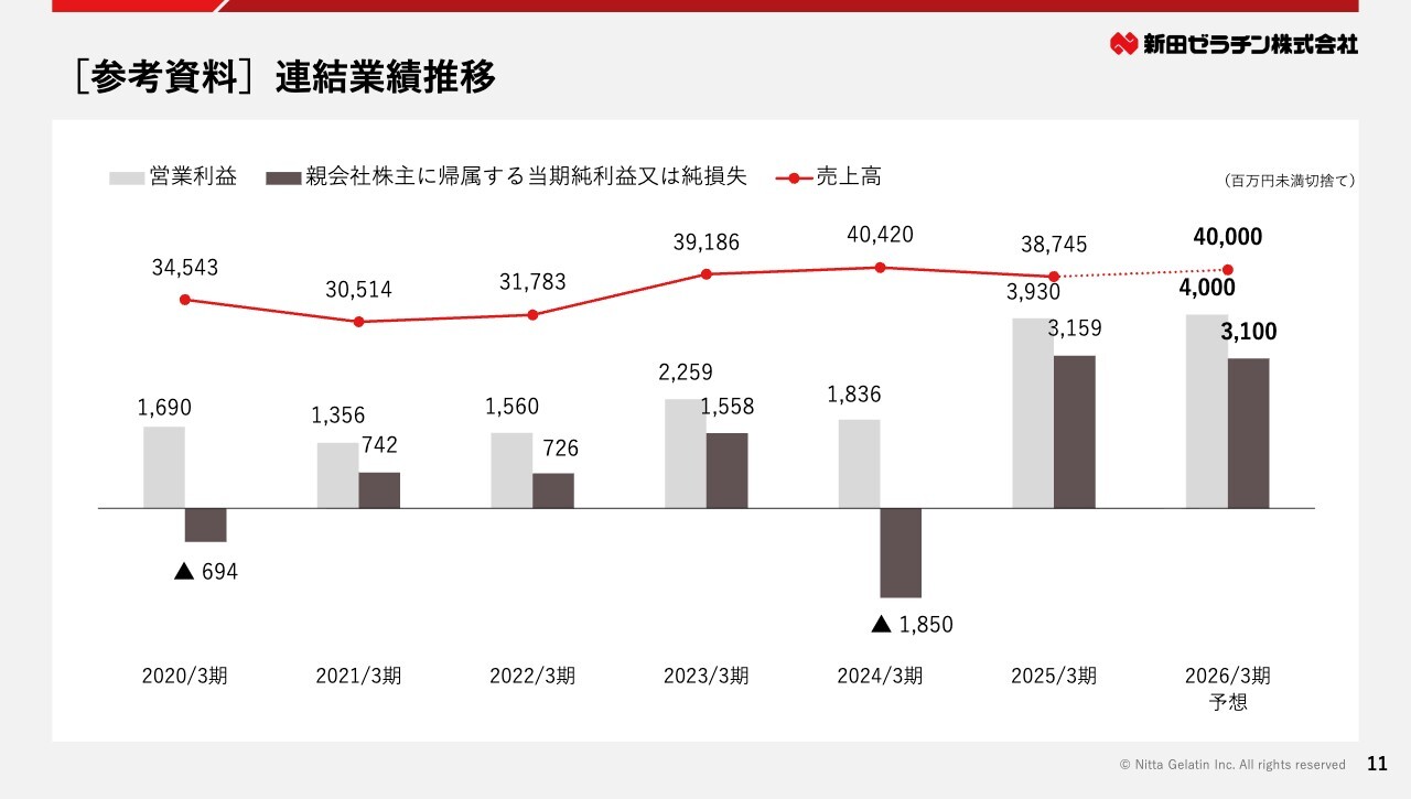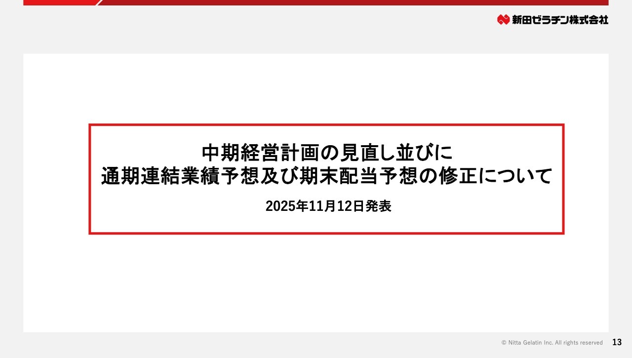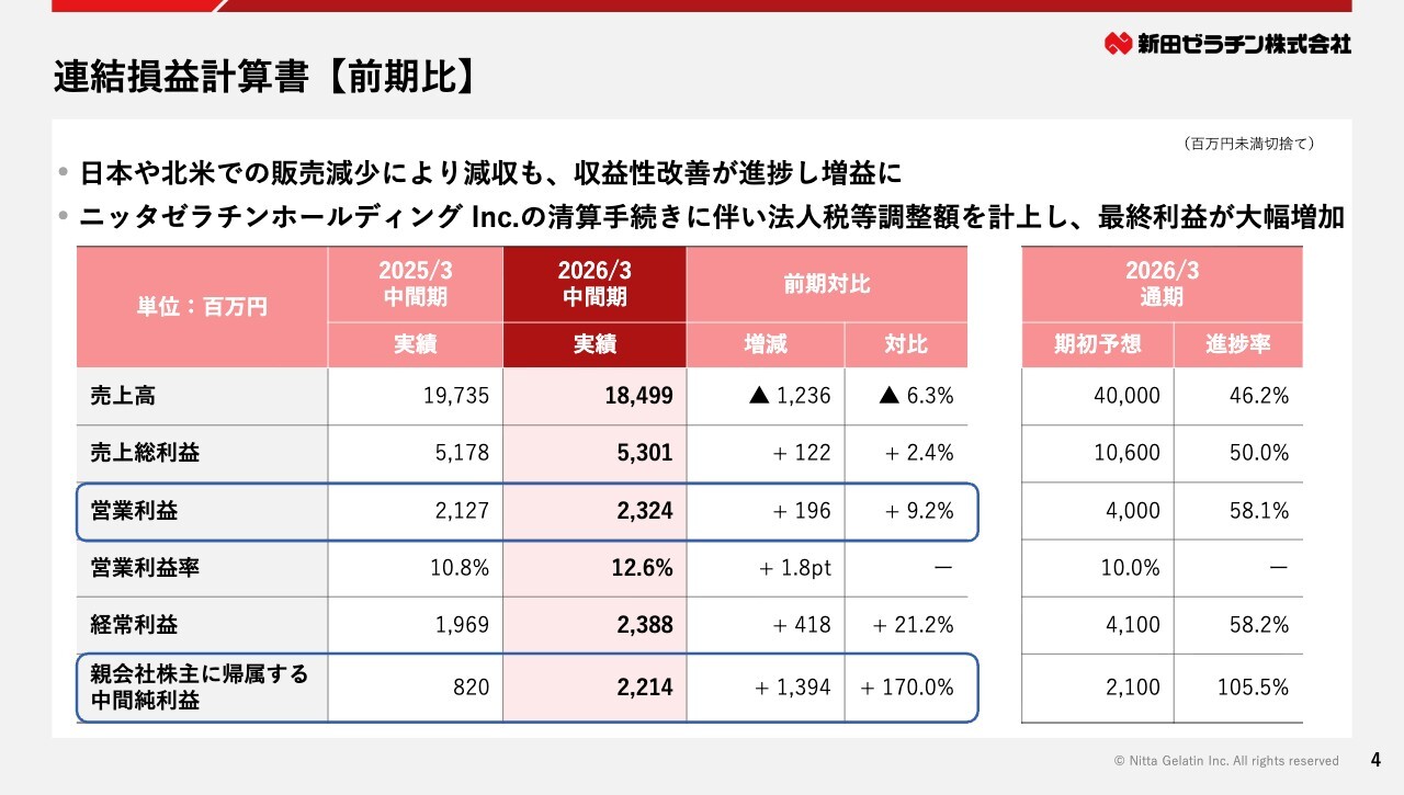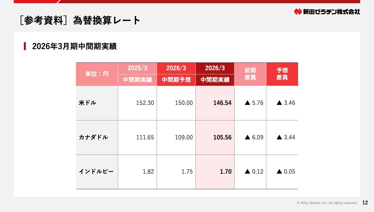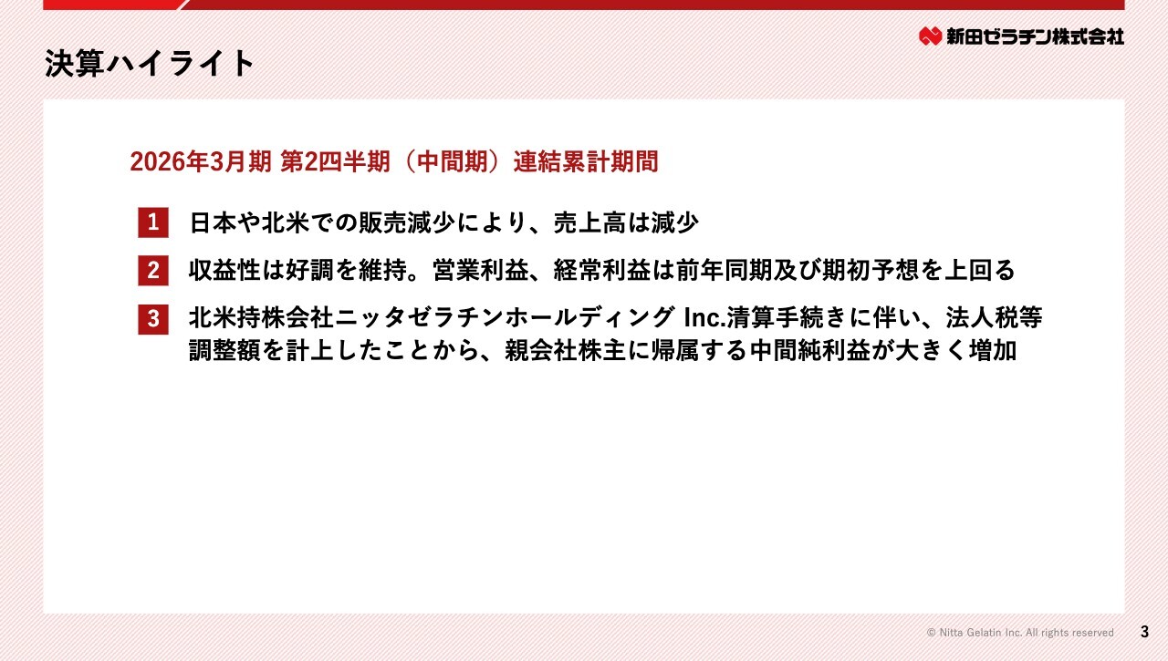 また、北米の持株会社ニッタゼラチンホールディングについては、本年7月にニッタゼラチンユーエスエーを清算したことにより、傘下にあるのが販売会社であるニッタゼラチンエヌエー1社のみとなりました。このため、今後は日本から直接管理するほうが効率的であると判断し、本年8月に解散を決議しています。同社の清算手続きに伴い、法人税等調整額を計上したことから、親会社株主に帰属する中間純利益が大きく増加しました。