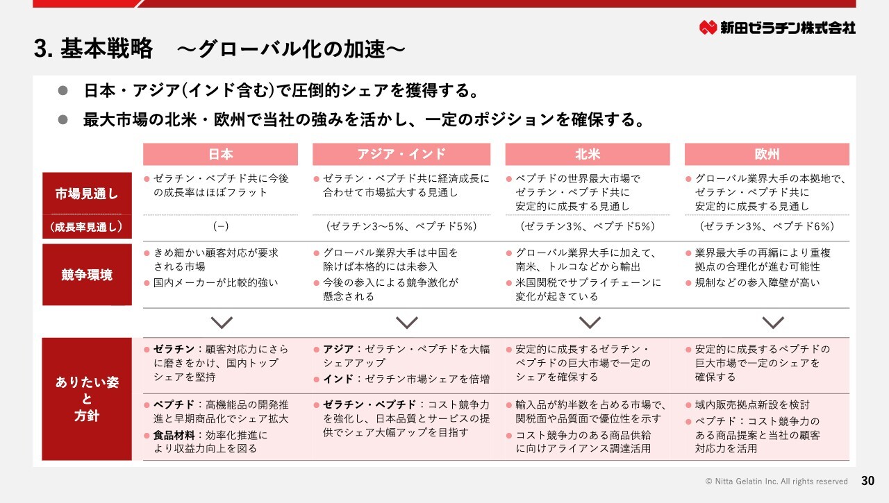 「海外市場の規模拡大」や「海外安価ゼラチンへの対応」といった外部環境のもとで「信頼性、顧客対応力、安定品質」といった当社の強みを活かし、海外市場での販売力強化と供給能力の拡大及びアライアンスの活用を進めることで、競争力を強化していきます。