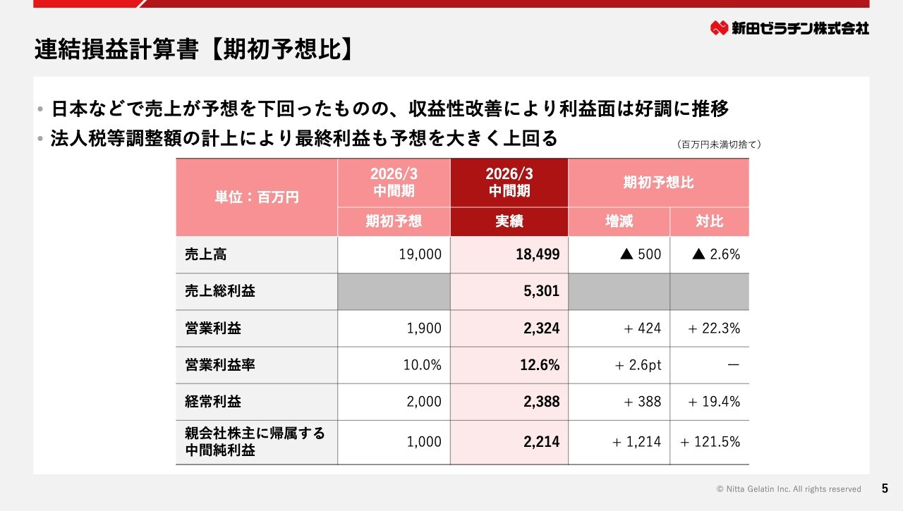 売上高は、期初予想比マイナス5億円となりました。日本などでの販売が計画を下回りました。