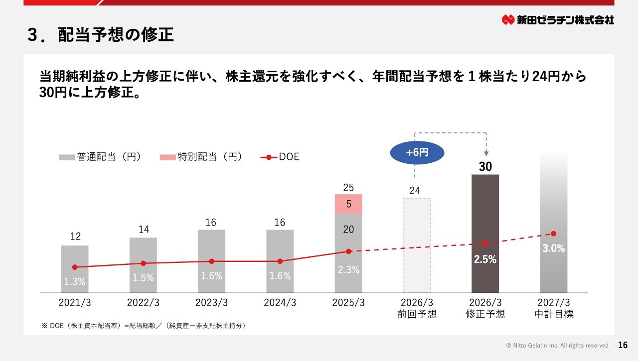 親会社株主に帰属する当期純利益の通期予想を上方修正したことに伴い、年間の配当予想を、当初予定の1株当たり24円から、6円の増配となる30円とします。これにより、今期のDOEは2.5パーセントとなる見込みであり、中計最終年度の目標である3.0パーセントに向けて、その水準を引き上げていきます。