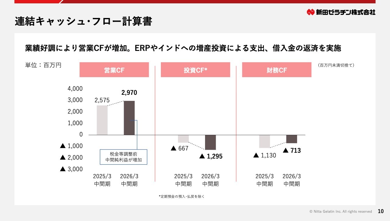 営業活動によるキャッシュフローでは、好調な業績により税金等調整前中間純利益が増加しました。