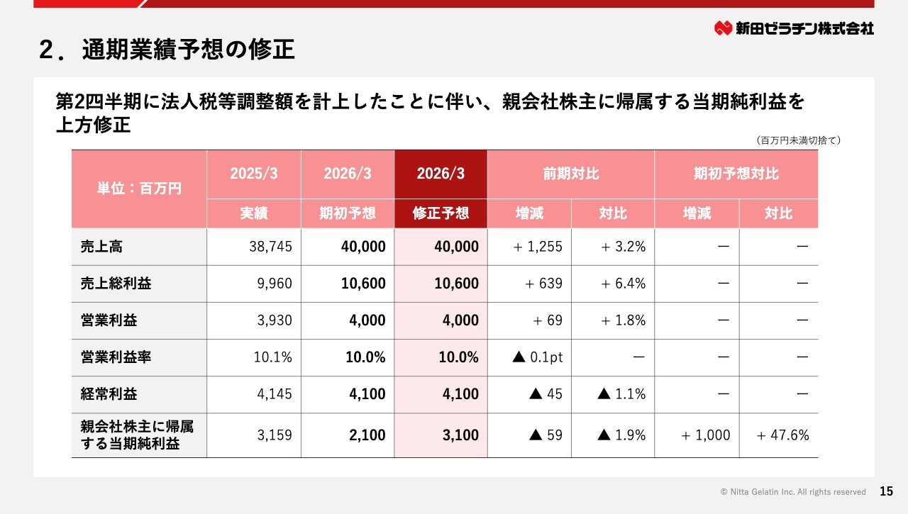 次に、今期、2026年3月期の通期連結業績予想の修正についてご説明します。