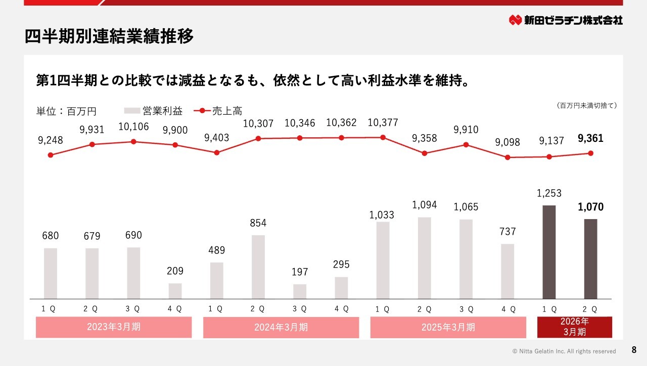 2026年3月期第2四半期の営業利益は、10億7,000万円となり、第1四半期との比較では減益となりましたが、依然として高い利益水準を維持しています。