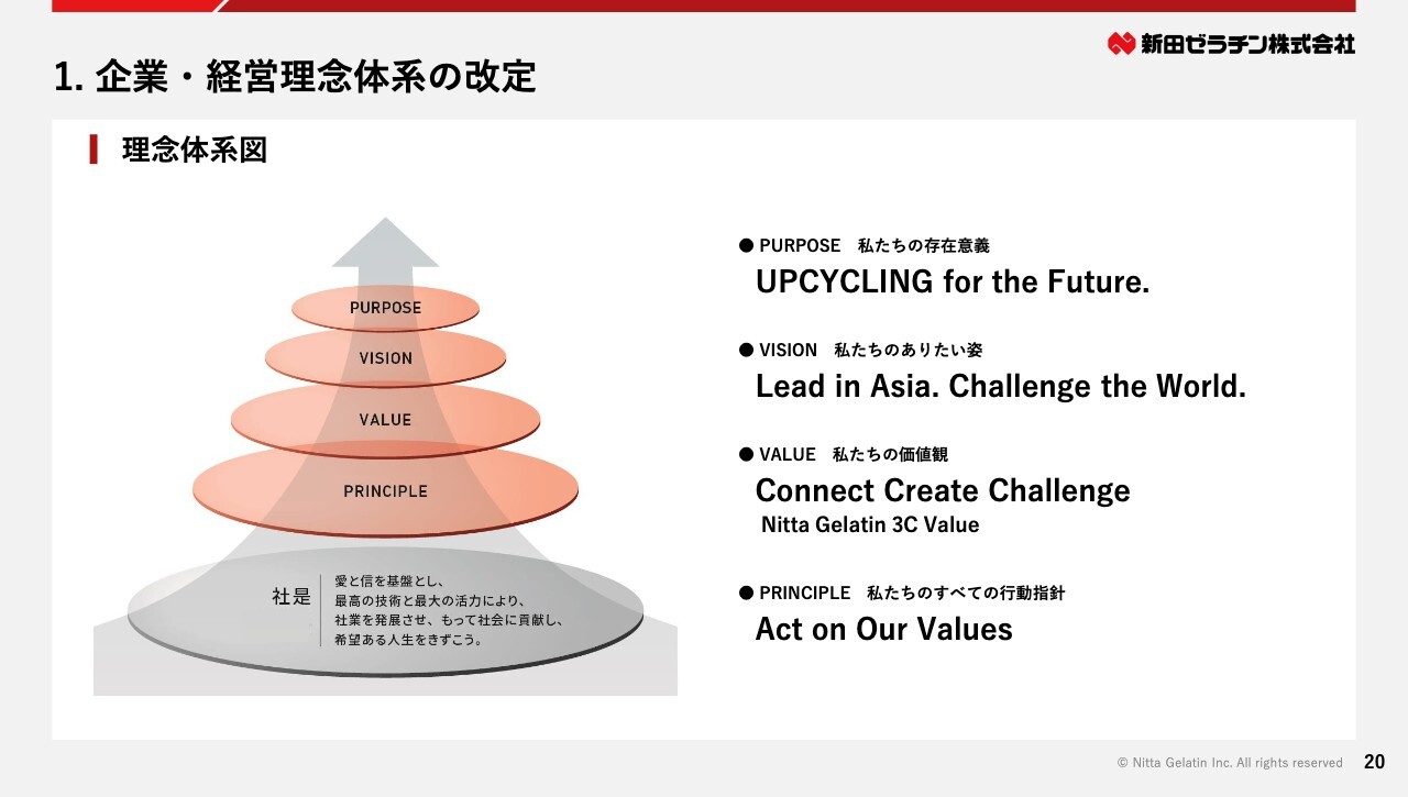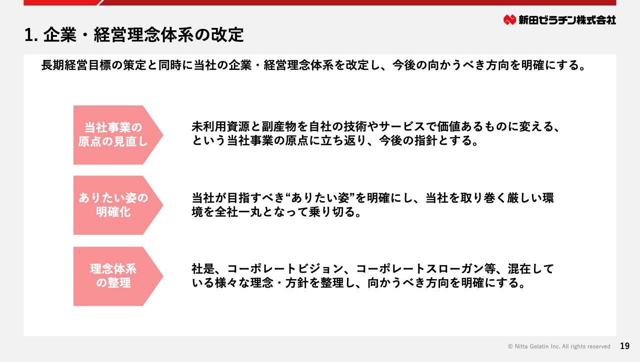 まず、当社は、長期経営目標の策定と同時に、企業・理念体系を改定し、今後の向かうべき方向性を明確にしました。改定の目的は3つあります。