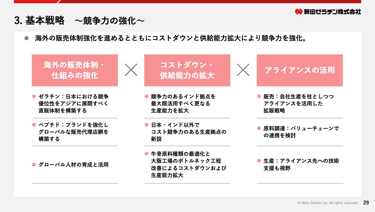 2つ目は、「コストダウン・供給能力の拡大」です。競争力のあるインド拠点を最大限活用すべく生産能力を拡大するとともに、さらなる生産拠点の新設も検討します。また、牛骨原料の最適化や大阪工場のボトルネック工程改善によるコストダウン・生産能力拡大も進めます。