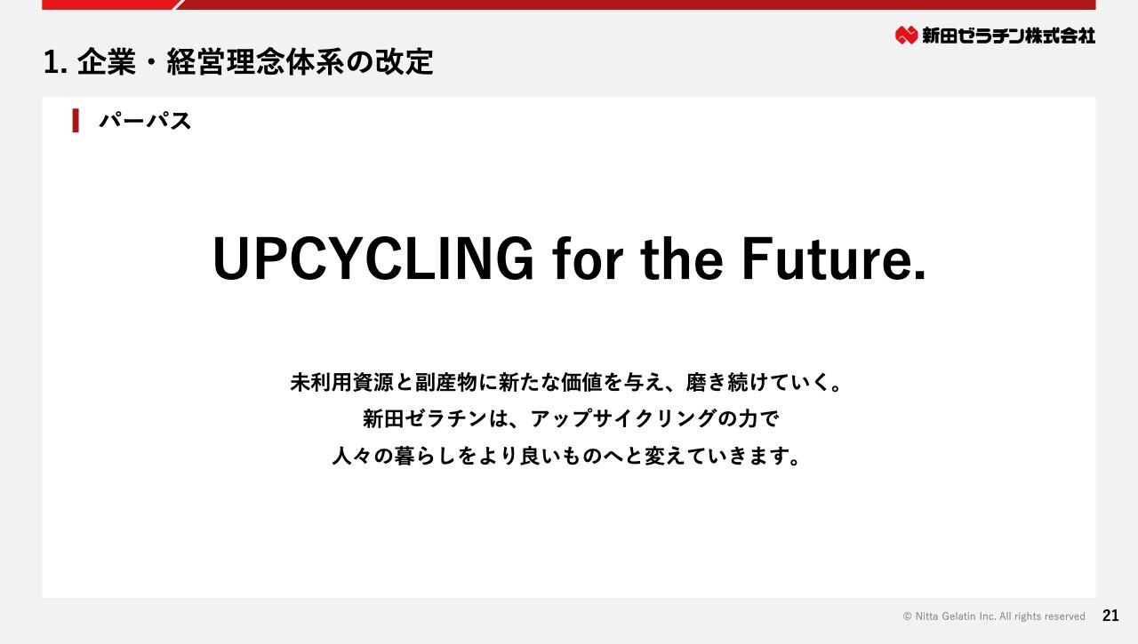 今回策定したパーパス、「UPCYCLING for the Future.」は、「未利用資源と副産物に新たな価値を与え、磨き続けていく」という、当社の事業の根幹を表しています。新田ゼラチンは、このアップサイクリングの力を通じて、人々の暮らしをより良いものへと変えていくことを目指します。