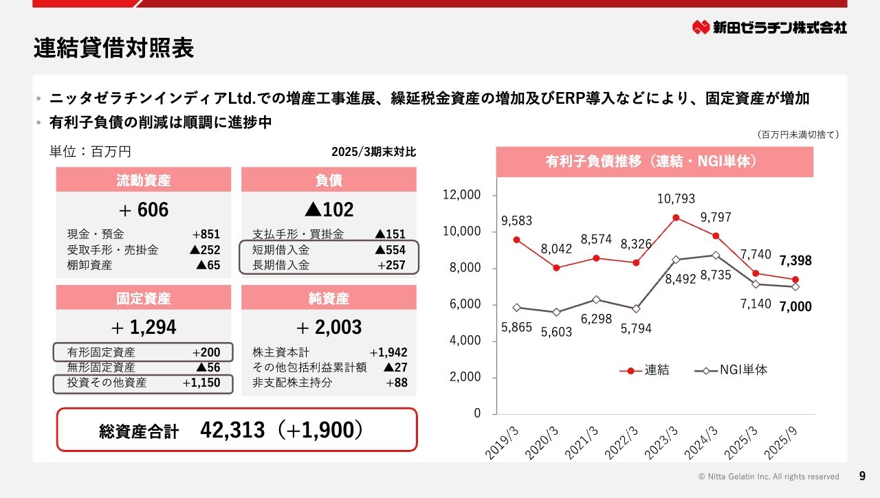 固定資産は、前期末から12億9,400万円増加しました。ニッタゼラチンインディアでの増産工事の進展や、ニッタゼラチンホールディングの清算手続きに伴う繰延税金資産の増加、並びにERPの導入などが要因です。