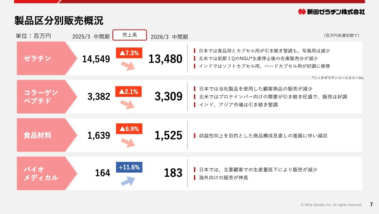 ゼラチンは、前期比でマイナス7.3パーセントとなりました。日本では食品用とカプセル用が引き続き堅調に推移したものの、写真用の販売が減少しました。北米では、前期の第1四半期に、ニッタゼラチンユーエスエーの生産停止後の在庫販売分があった影響などにより、減少となりました。インドでは、ソフトカプセル用、ハードカプセル用が共に好調に推移しました。