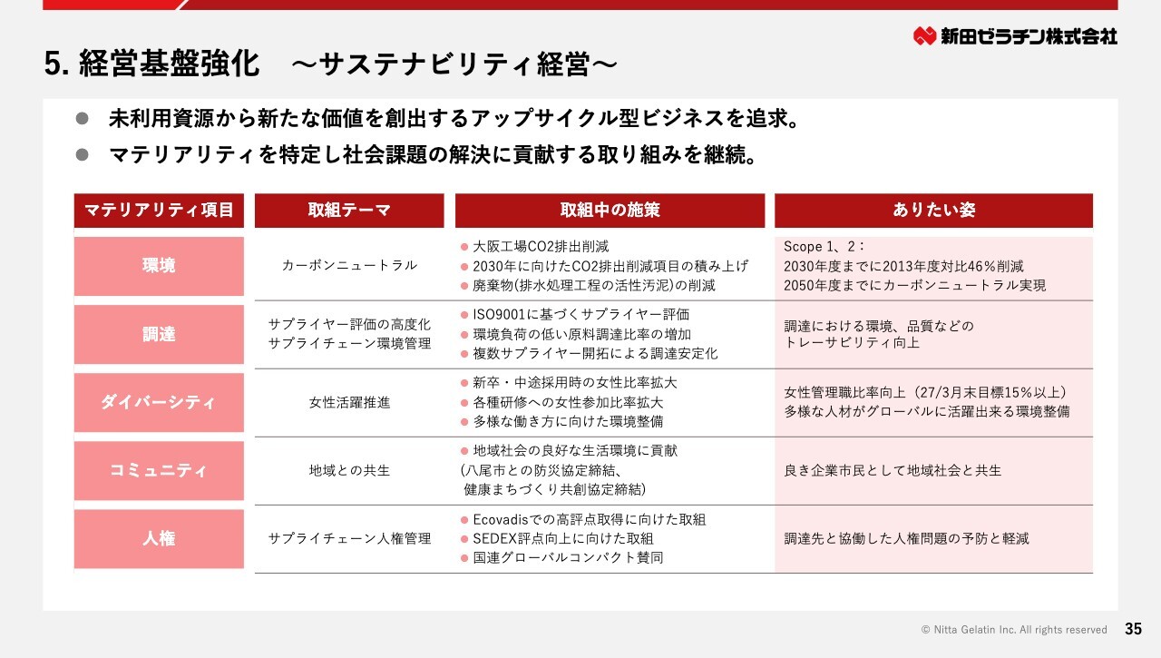 最後に、サステナビリティ経営ですが、当社はパーパスで掲げた「UPCYCLING for the Future.」を目指し、未利用資源から新たな価値を創出するアップサイクル型ビジネスを引き続き追求していきます。
