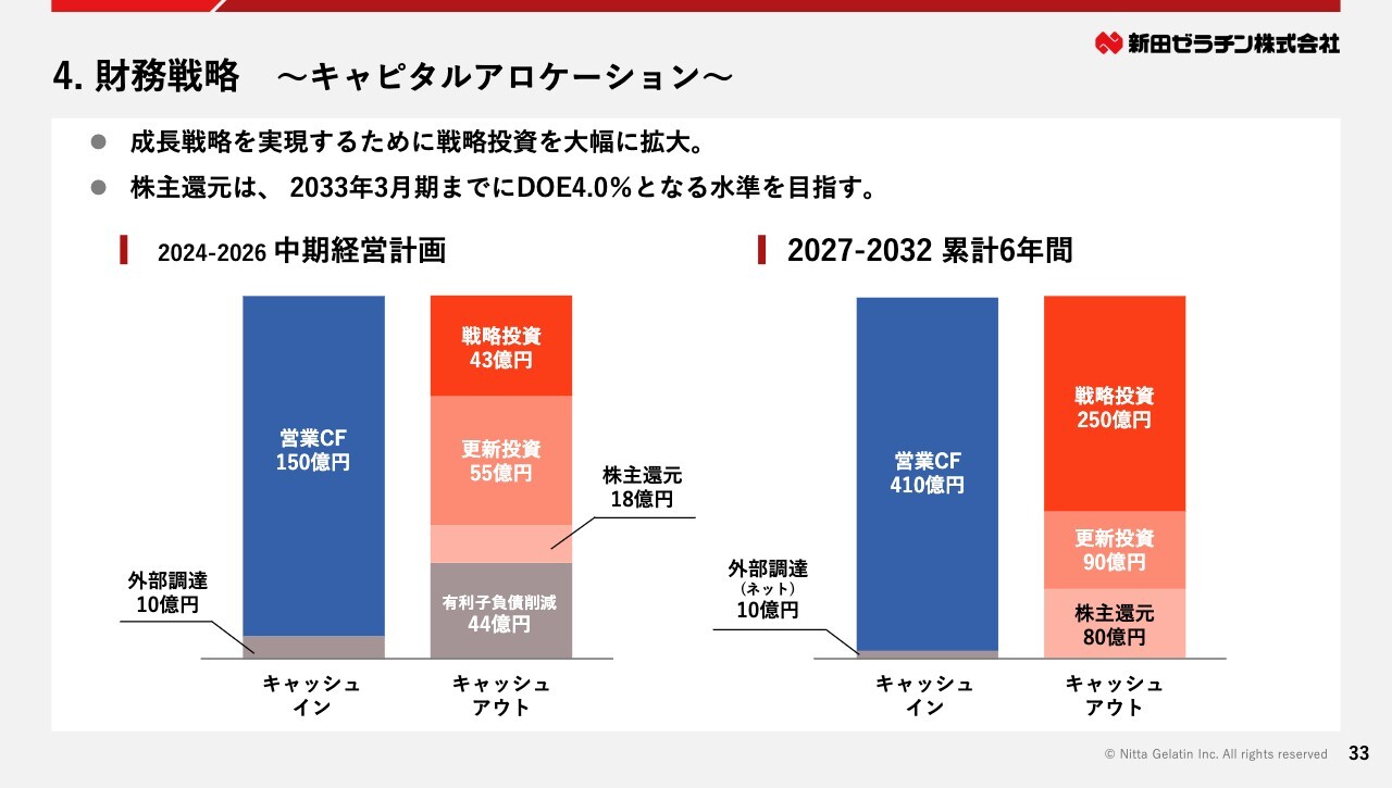 ここでお示ししている、左の図は現行の中期経営計画、右の図はそれ以降、2033年3月期までの6年間のキャピタルアロケーションです。収益力の強化により累計の営業キャッシュフローは410億円と現在の水準の1.4倍になります。戦略投資は250億円と2.9倍になります。株主還元も80億円と2.2倍にします。