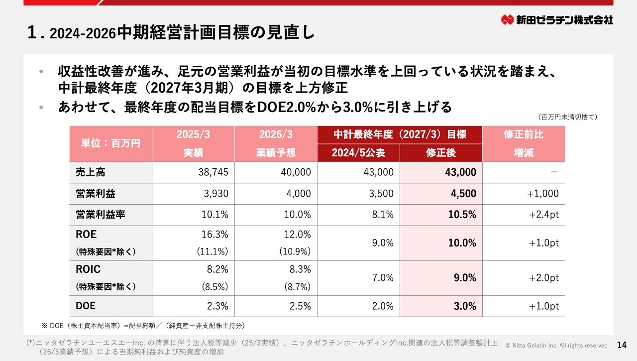また、資本効率の指標についても、ROEは9.0パーセントから10.0パーセントへ、ROICは7.0パーセントから9.0パーセントへ、それぞれ目標を引き上げました。