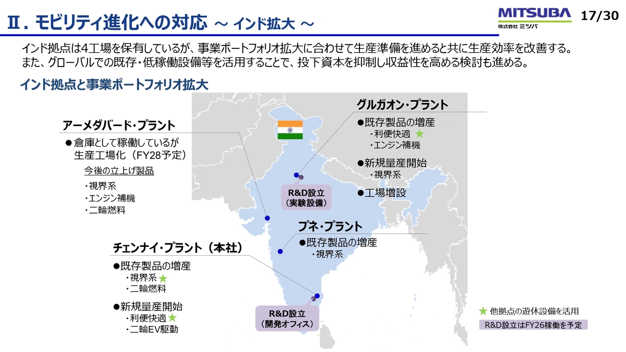 最下段のチェンナイ・プラントでは、既存製品の増産に加え、新規量産を開始する製品の予定があります。現在、パススルーで行っているものを現地調達化する計画や、二輪EV駆動のようなまったく新しい取り組みも計画しています。